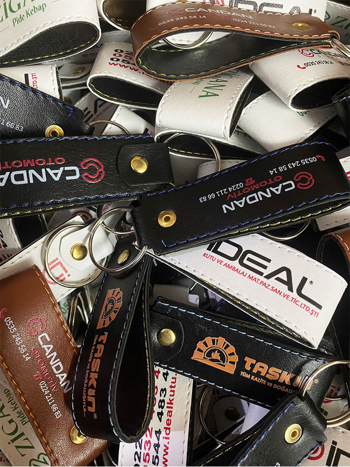 Anahtarlıklar seçilirken model, tasarım, renk olarak her müşteriye göre değişiklik gösterir. Çoğunlukla uygun maliyette çeşit çeşit reklam alanı olan farklı materyallerde anahtarlarımız mevcuttur. Anahtarlıklarımızın Lazer Kazıma, UV Baskı, Tampon Baskı, Domeks Etiket Baskılı, Sıcak Baskı gibi baskı çeşitleriyle üretimini sağlıyoruz.